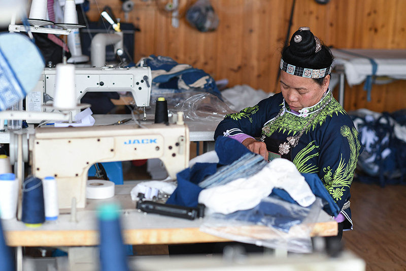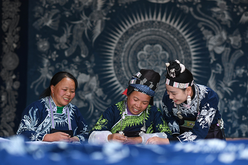在贵州省丹寨县龙泉镇卡拉村的苗族蜡染工坊,村民在赶制蜡染文创订单产品(11月16日摄)。