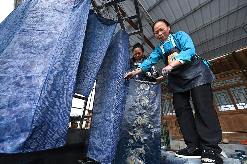 在贵州省丹寨县龙泉镇卡拉村的苗族蜡染工坊,村民在浸染蜡画(11月16日摄)。