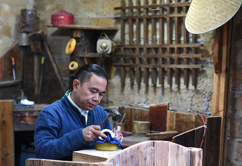 在贵州省丹寨县龙泉镇卡拉村的银饰锻造工坊,苗族手工艺人在制作银制器具(11月16日摄)。