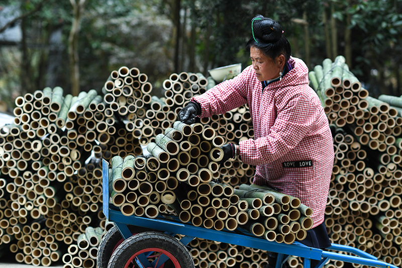11月17日,在贵州省丹寨县龙泉镇卡拉村,村民在搬运用于制作竹编鸟笼的竹子。