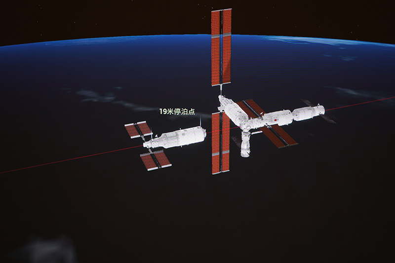 2022年11月1日在北京航天飞行控制中心拍摄的空间站梦天实验舱与空间站组合体在轨完成交会对接。这是梦天实验舱从19米停泊点向天和核心舱前向端口靠近的模拟图像。新华社发(孙丰晓 摄)