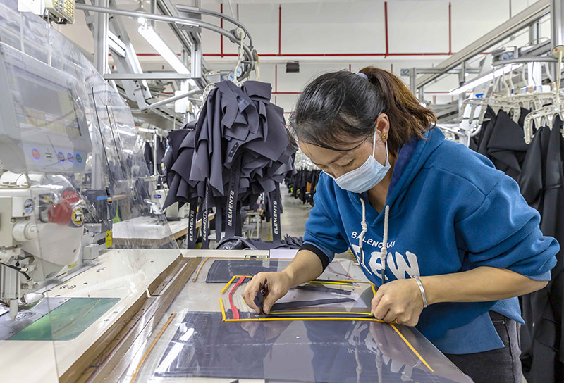 11月25日,员工在贵州省黔西市岔白工业园区一家服饰公司生产车间加工服装。