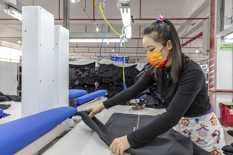 11月25日,员工在贵州省黔西市岔白工业园区一家服饰公司成品仓库分摆成品。