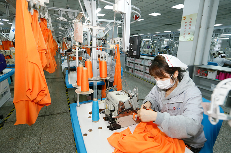 近日,山东省青岛市即墨区纺织服装企业外贸订单充足,工人们加紧生产,供应市场。