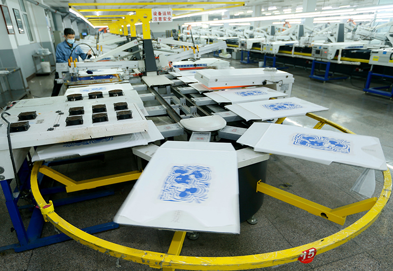 11月29日,山东青岛华信印花有限公司的技术工人在生产出口到海外市场的服装产品。