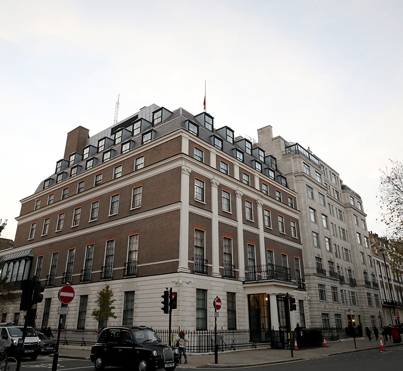 11月30日,中国驻英国大使馆下半旗志哀,悼念江泽民同志逝世。