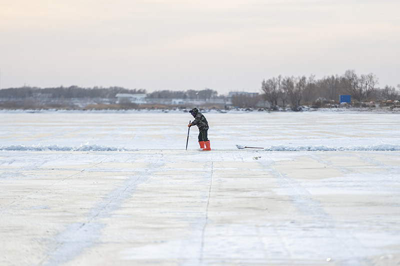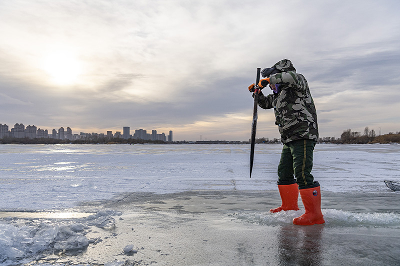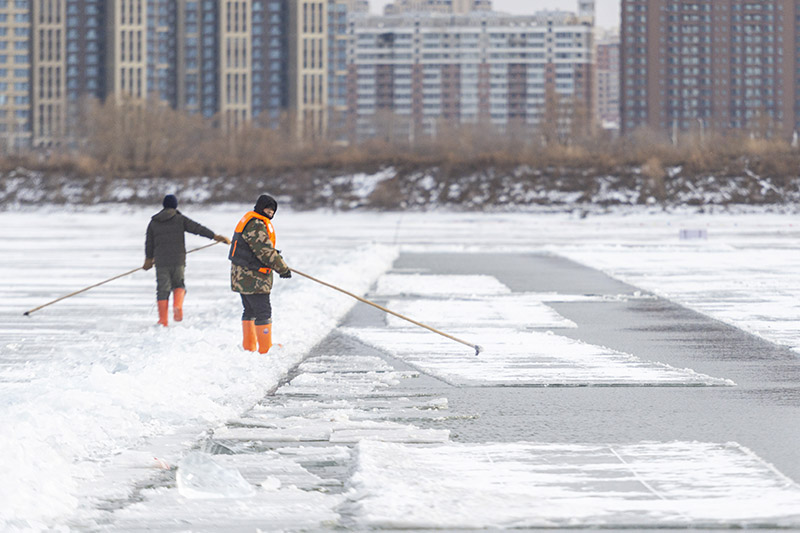 12月6日,工人在松花江哈尔滨段封冻的江面上采冰。
