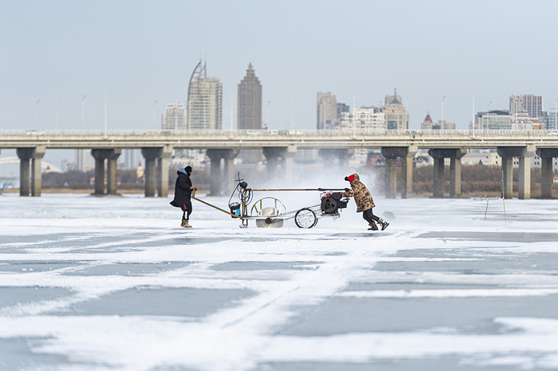 目前,“冰城”哈尔滨市已进入“采冰季”。工人从封冻的松花江采冰,并将冰块运往哈尔滨市的重要景点等地,用于冰雪景观的搭建制作。
