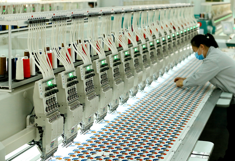 12月16日,青岛市即墨区一家服装绣花企业的工人在生产出口到海外市场的产品。