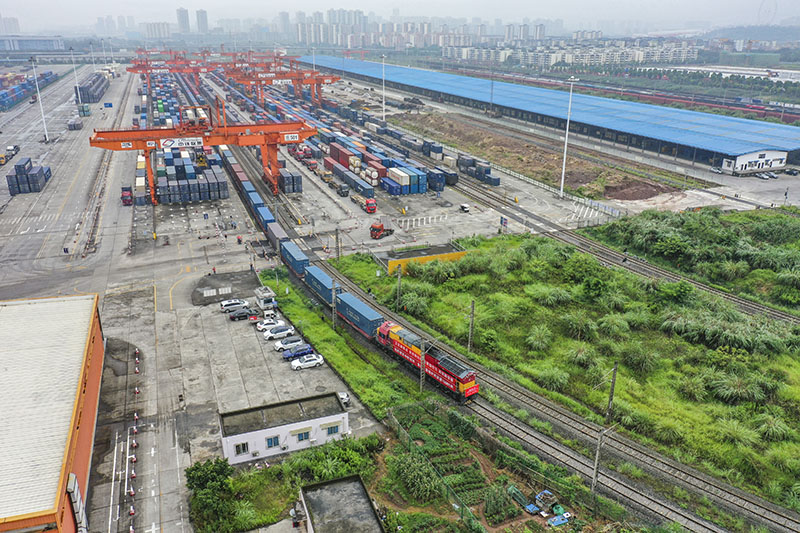 中欧班列(重庆)第10000列列车在重庆团结村中心站顺利驶出(2022年6月23日摄,无人机照片)。