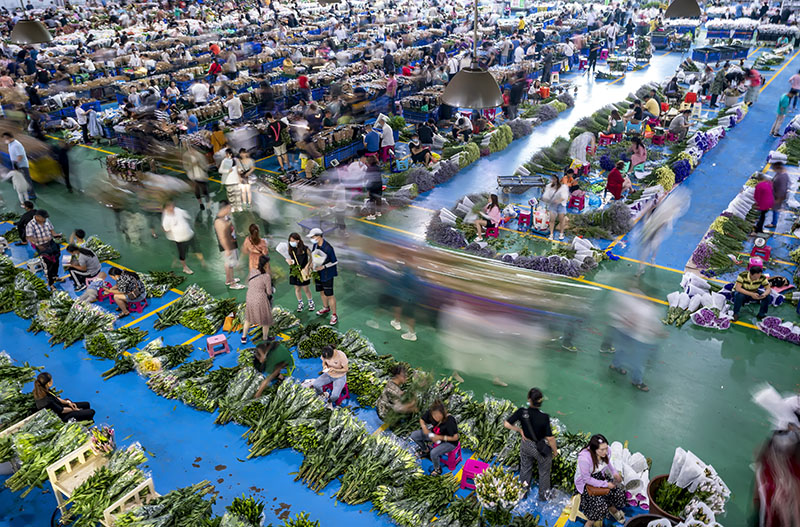 游客在夜间游览云南昆明斗南花卉交易市场并选购鲜花(2022年7月12日摄)。昆明斗南被誉为“亚洲花都”,鲜花远销50多个国家和地区。近年来,作为花卉交易及游览景区的斗南花市根据夜间交易及人流量特点,以花卉消费体验、旅游体验、文化体验为特色大力发展“夜经济”。