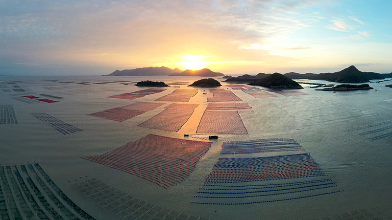 渔船沐浴朝霞,行驶在福建省霞浦县三沙镇海上养殖区(2022年10月26日摄,无人机照片)。