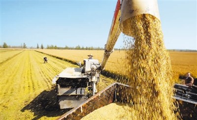 图为在山东省临沂市郯城县郯城街道,农民将收获的水稻装车。张春雷 摄(新华社发)
