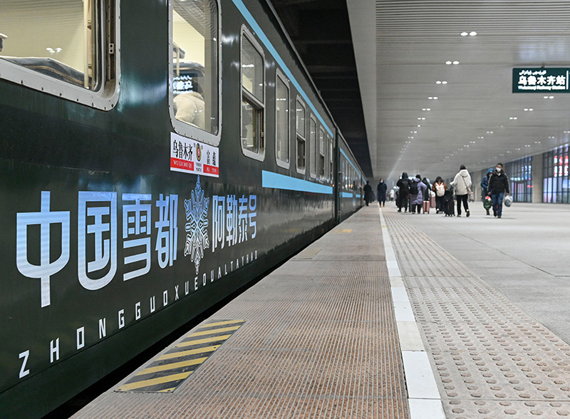 12月28日,在乌鲁木齐站,旅客乘坐Y965次“中国雪都·阿勒泰号”冰雪游旅客列车准备出发。