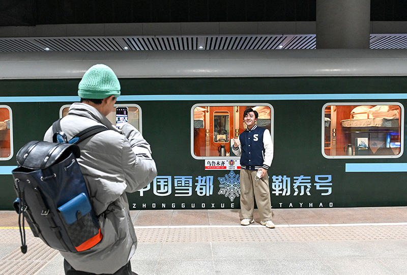 12月28日,在乌鲁木齐站,旅客在Y965次“中国雪都·阿勒泰号”冰雪游旅客列车旁拍照留念。