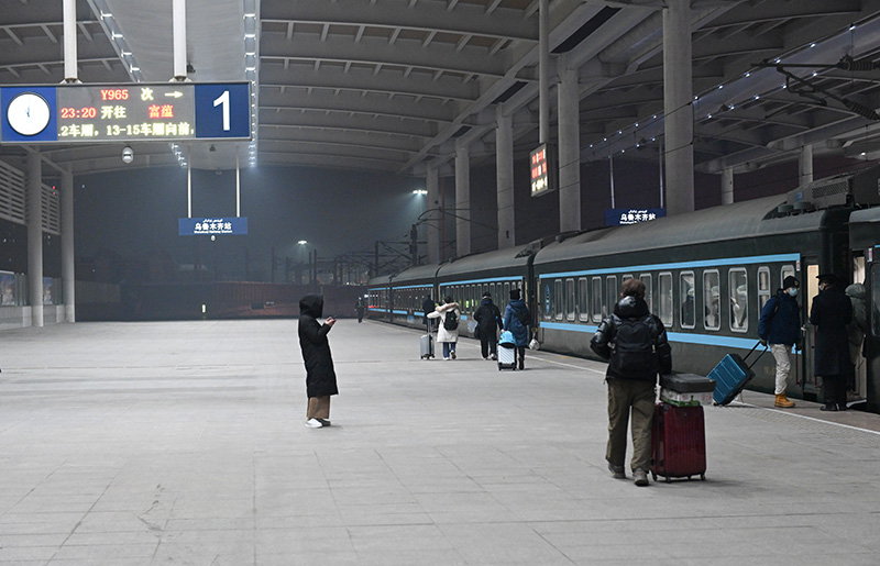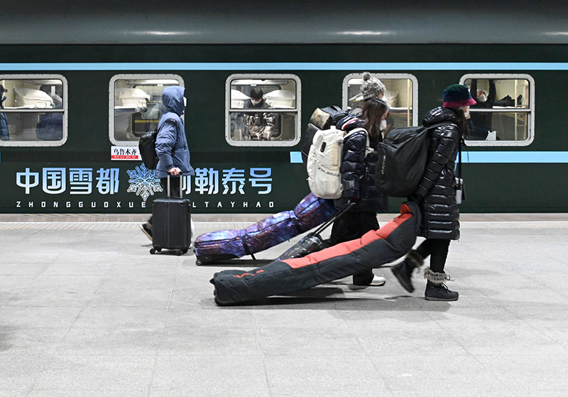 12月28日,旅客在乌鲁木齐站登上Y965次“中国雪都·阿勒泰号”冰雪游旅客列车。