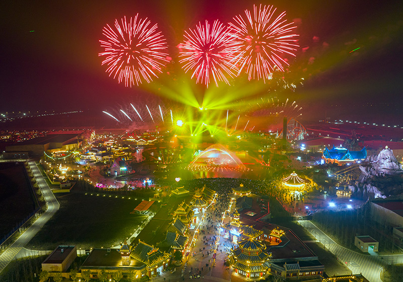 2022年12月31日,在江苏省淮安市西游乐园,游客观赏跨年烟花灯光秀(无人机照片)。