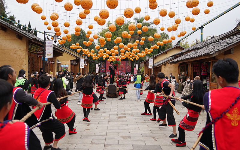 2022年12月31日,在云南省昆明市云南民族村佤族寨内,演员在为游客表演佤族传统舞蹈。