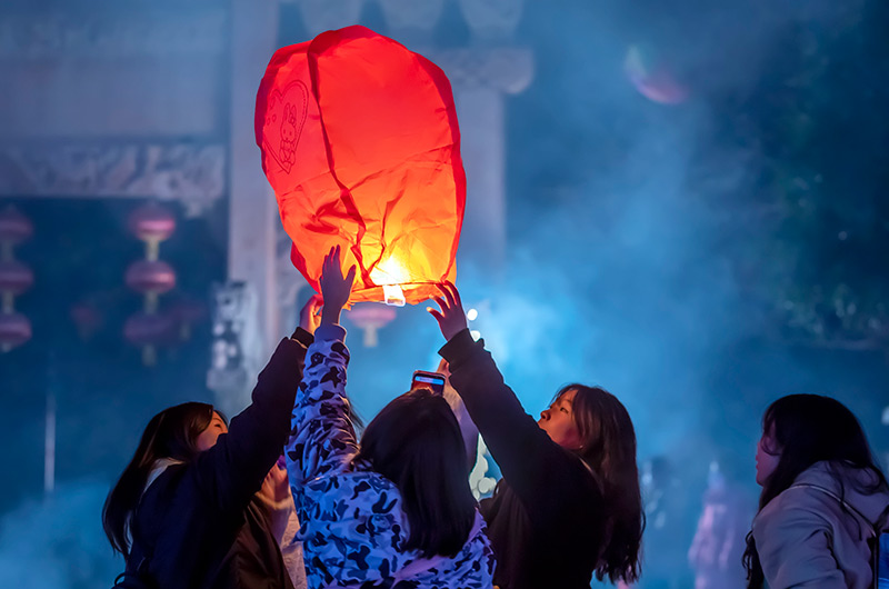 1月1日,群众在贵州省黔西市水西公园放飞孔明灯寄托新年的祝福。