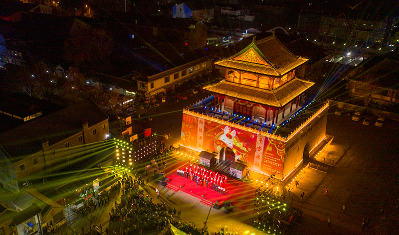 1月1日凌晨,在天津市南开区鼓楼商业街,人们在观看天津鼓楼城墙灯光秀(无人机照片)。