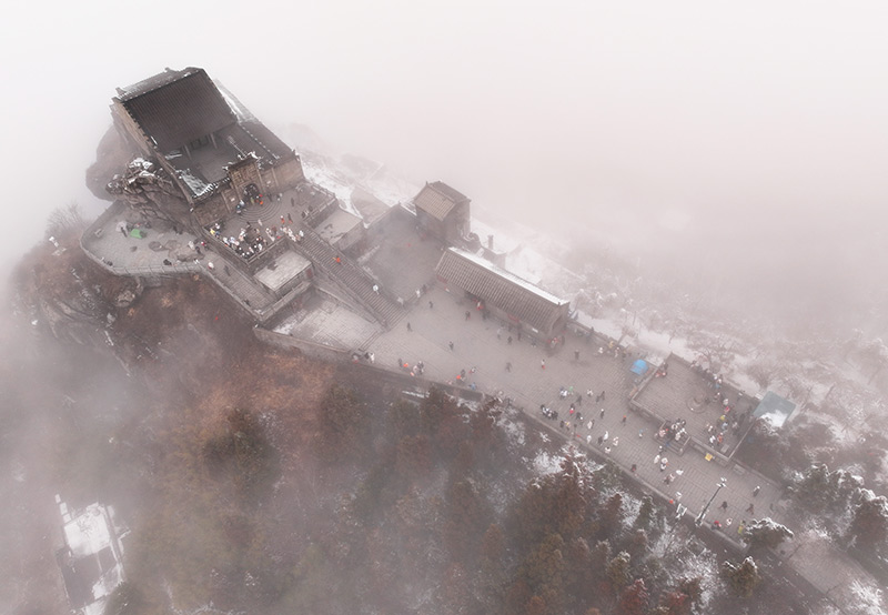 1月1日,游客在湖南省衡阳市南岳衡山风景区祝融峰顶游玩(无人机照片)。