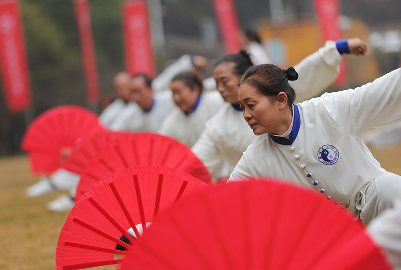 1月1日,太极爱好者在湖南张家界国家森林公园大氧吧广场进行太极展演,在新年第一天享受健身乐趣。