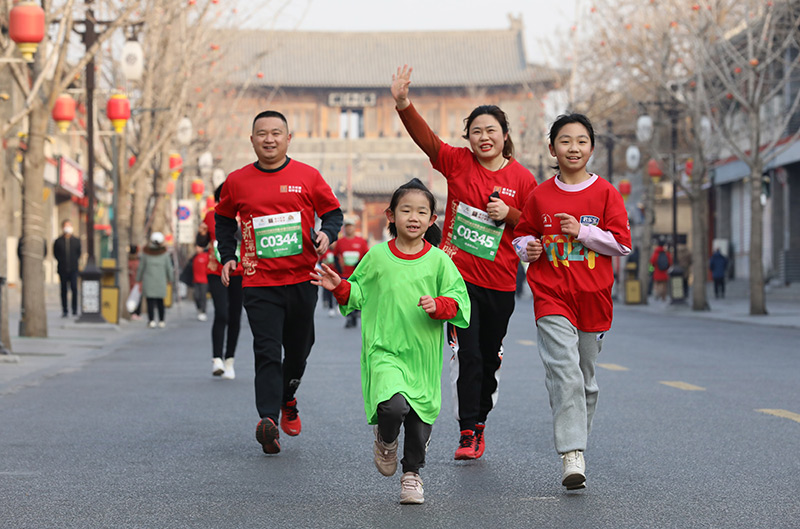 1月1日,在河北省石家庄市正定古城,人们参加元旦长跑活动。