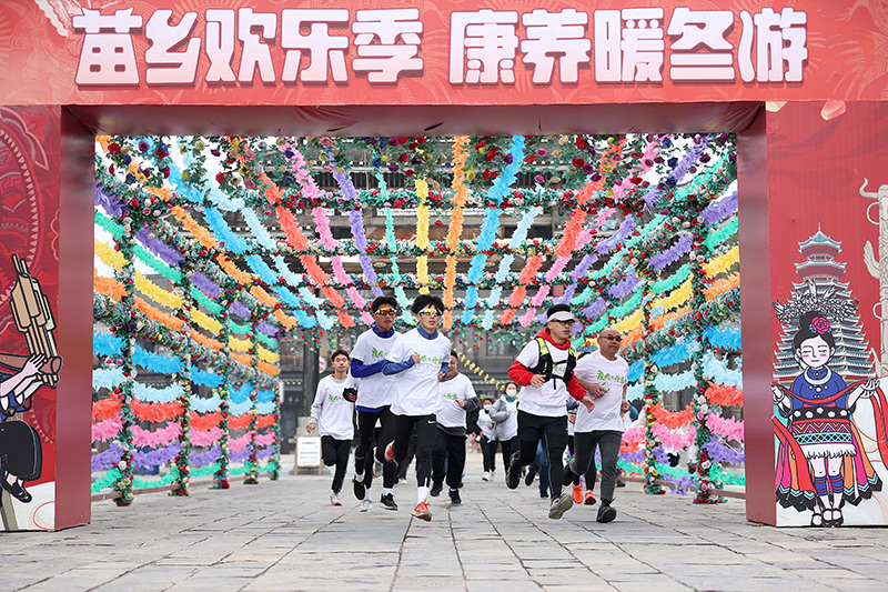 1月1日,跑步爱好者在贵州省黔东南苗族侗族自治州丹寨县万达小镇参加迎新年健康跑活动。