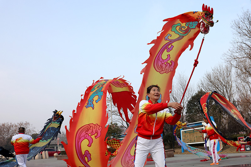 1月1日,在山东省枣庄市光明路街道西沙河公园,“彩带龙”爱好者舞“彩龙”迎新年。