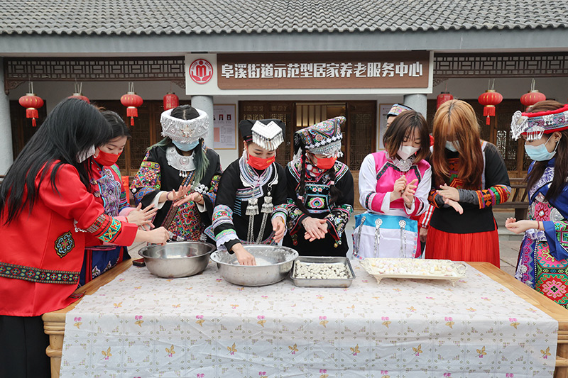 1月1日,在浙江省湖州市德清县阜溪街道兴山社区居家养老服务中心,少数民族群众在做汤圆。