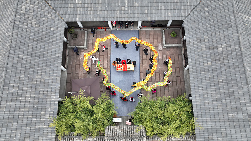 1月1日,在浙江省湖州市德清县阜溪街道兴山社区居家养老服务中心,少数民族群众在舞龙(无人机照片)。