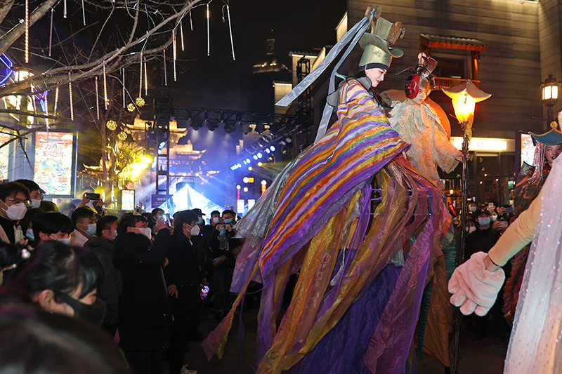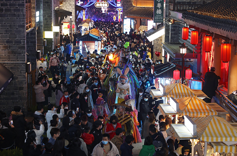 市民在江西省南昌市西湖区万寿宫历史文化街区观看巡游表演(2022年12月31日摄)。
