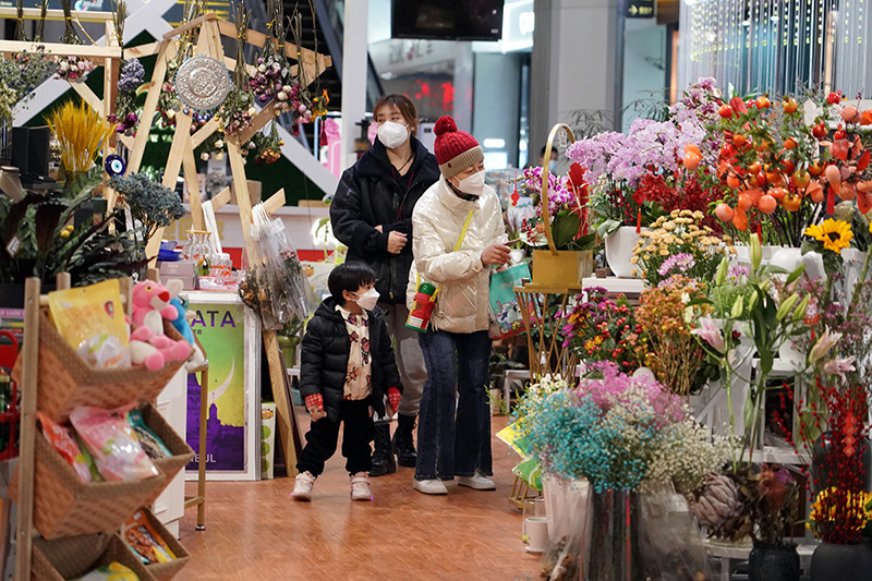 1月1日,顾客在北京世纪金源购物中心挑选鲜花。