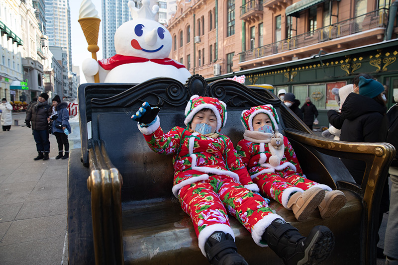 1月1日,小朋友在哈尔滨道里区中央大街游玩。