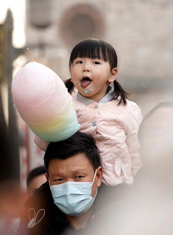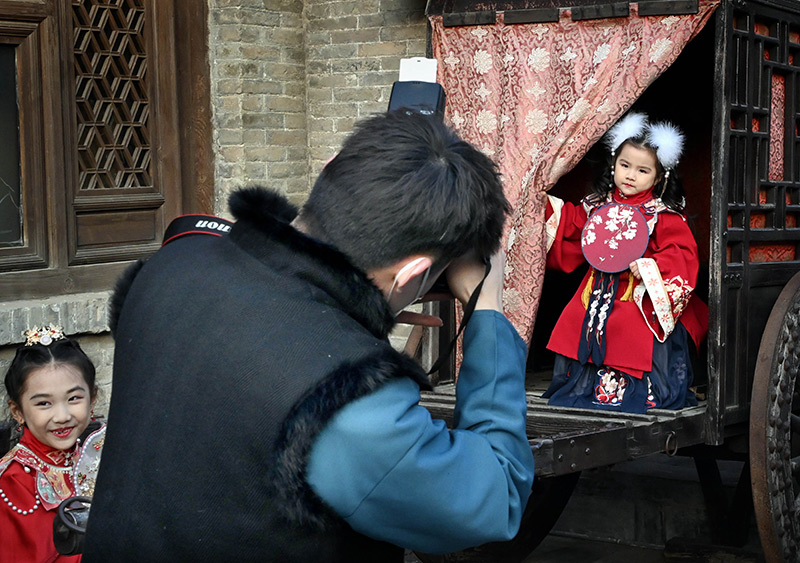 小朋友在位于郑州市中牟县的电影小镇拍照(2022年12月31日摄)。