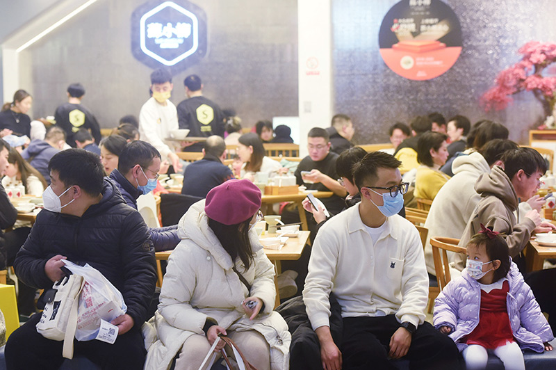 1月1日,顾客在杭州一家餐厅外等待就餐。