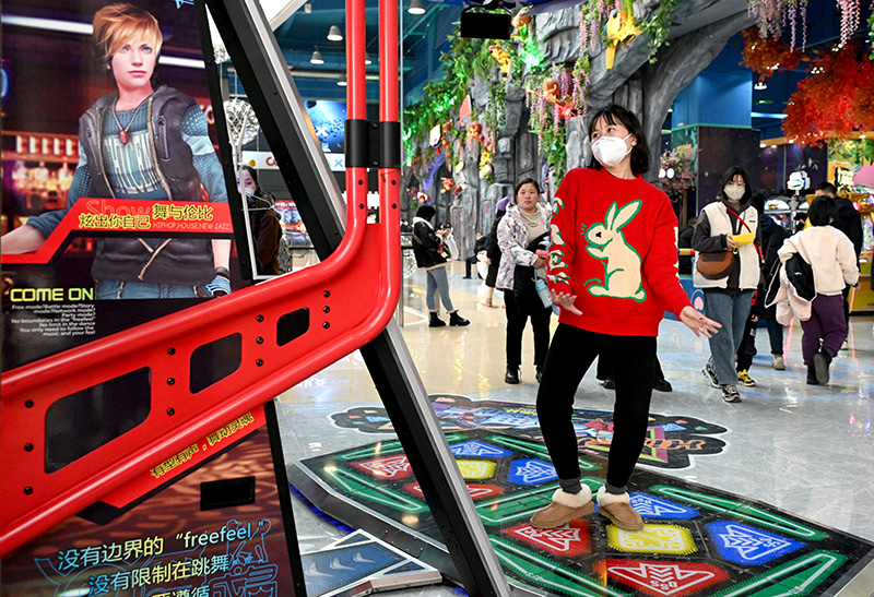 1月1日,一名市民在河北省邯郸市一家商场玩跳舞机。