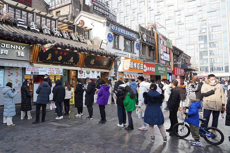 1月1日,游客在哈尔滨道里区中央大街排队购买食品。