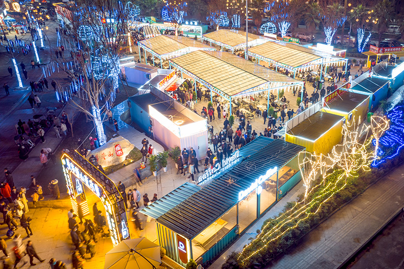 2022年12月31日晚,四川省华蓥市“华蓥山夜市”吸引市民前来购物、品尝美食(无人机照片)。