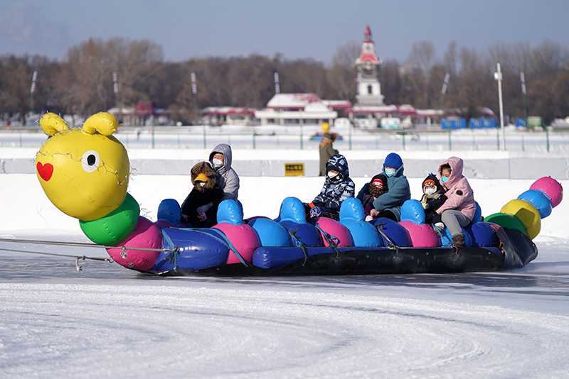 1月1日,游客在黑龙江省哈尔滨松花江冰雪嘉年华园区游玩。
