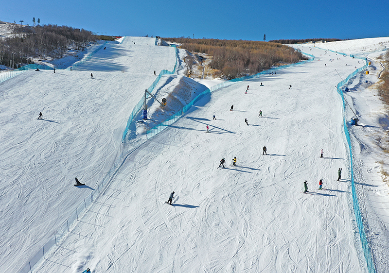 1月1日,滑雪爱好者在河北省张家口市崇礼区云顶滑雪公园滑雪(无人机照片)。