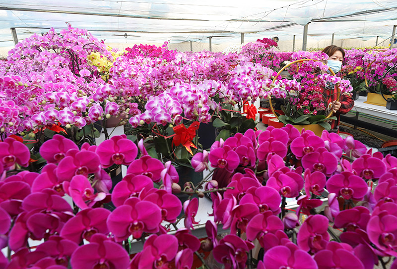 春节临近,在张家口经济开发区流平寺村智能化温室大棚内,多个品种的5万余株蝴蝶兰竞相开放,芳香四溢。这些蝴蝶兰将陆续包装外运,销往各地市场。