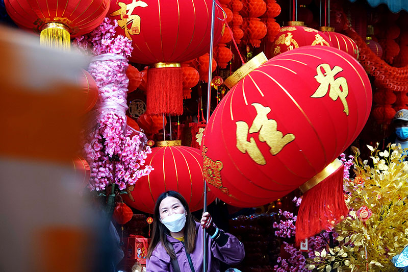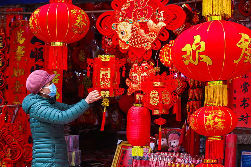 1月5日,市民在安徽合肥城隍庙市场选购新春饰品。