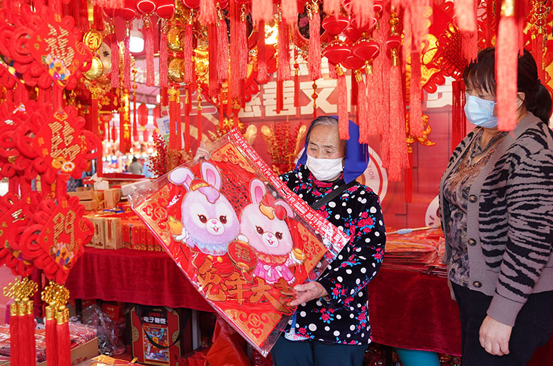 春节临近,年味渐浓,河南省信阳市以“兔年”为主题的各种对联、年画、“福”字等饰品纷纷上架,成为市民抢手的热门商品。