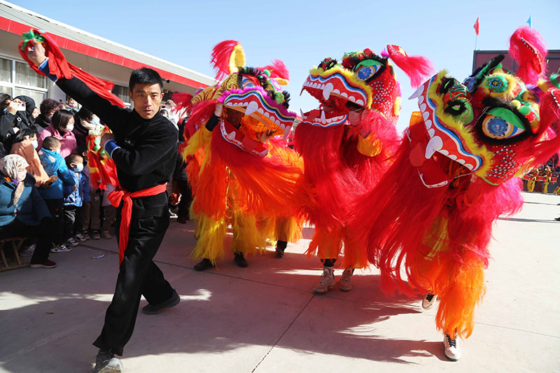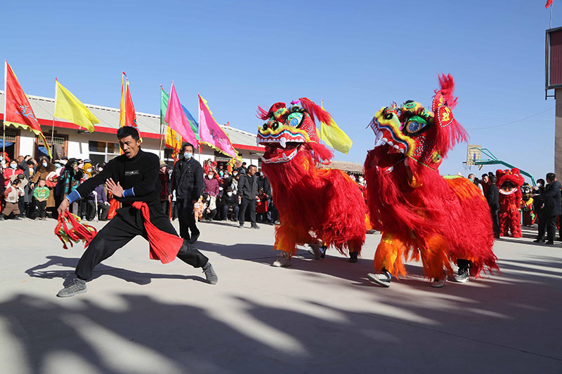 1月6日,甘肃省定西市安定区内官营镇万崖村社火队演练传统社火节目舞狮。