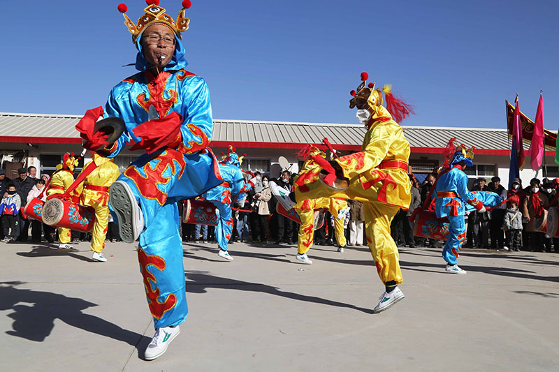 1月6日,甘肃省定西市安定区内官营镇万崖村社火队演练传统社火节目。