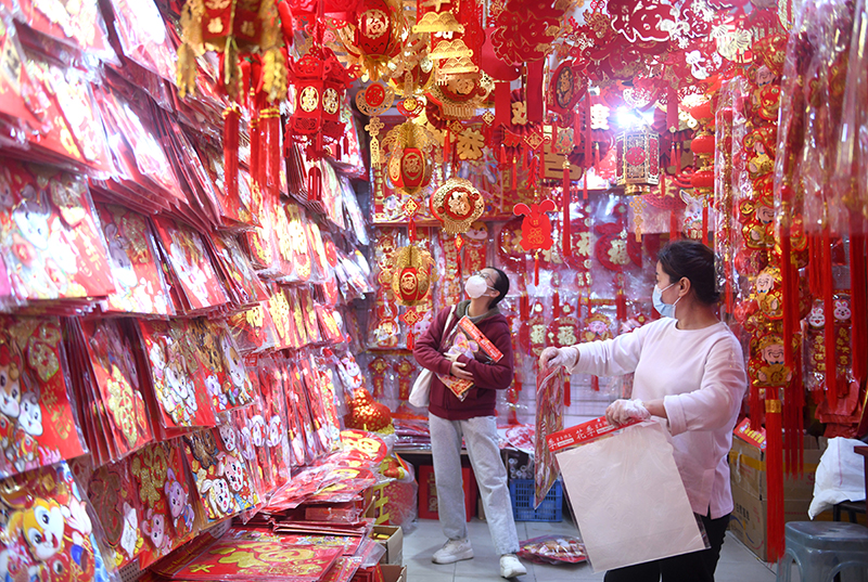 1月9日,在湖南省永州市道县商贸城,居民在选购春节饰品。