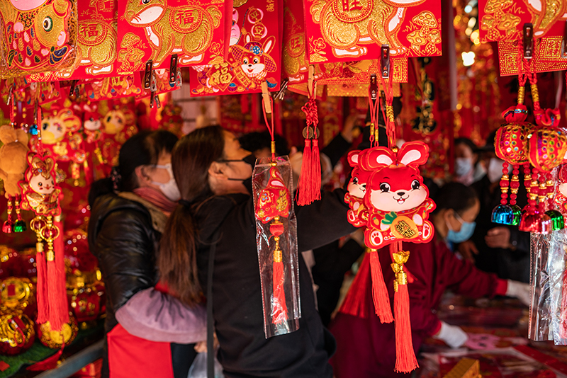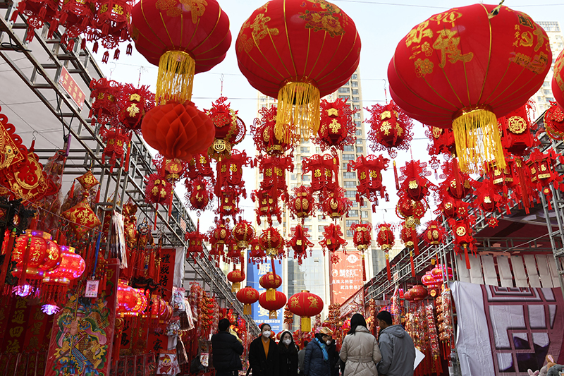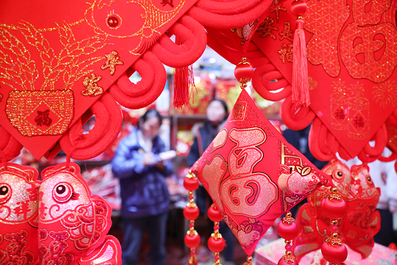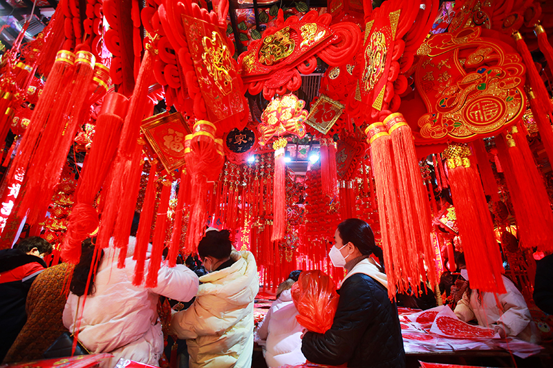春节临近,多地年货市场红火起来,人们选购春节饰品,迎接新春佳节。