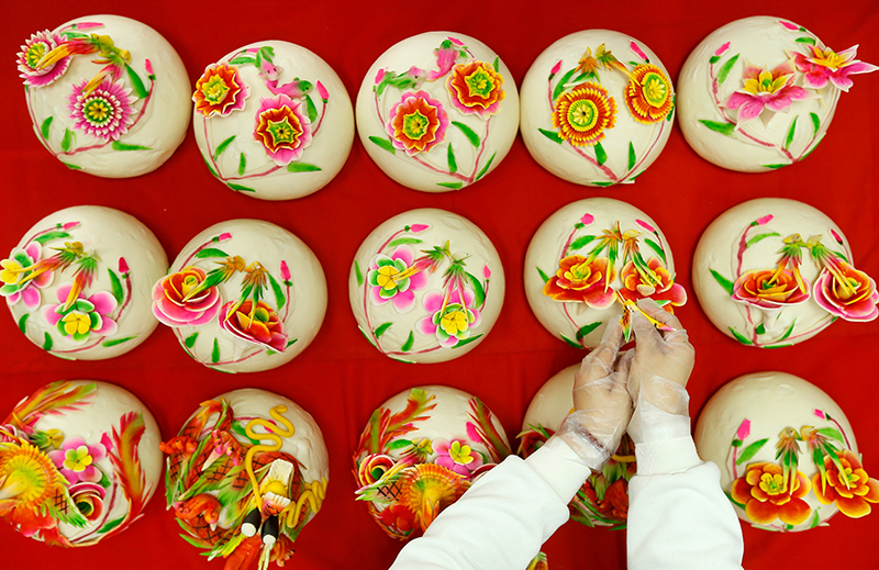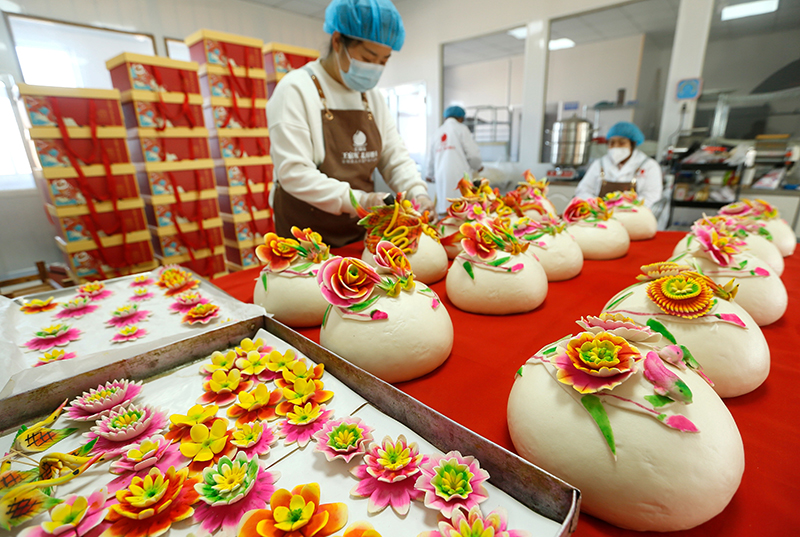 春节临近,山东省青岛市即墨区的农民赶制花馍等传统面食,供应节日市场。即墨当地有过年做花馍的习俗,寓意新的一年日子红红火火,生活蒸蒸日上。