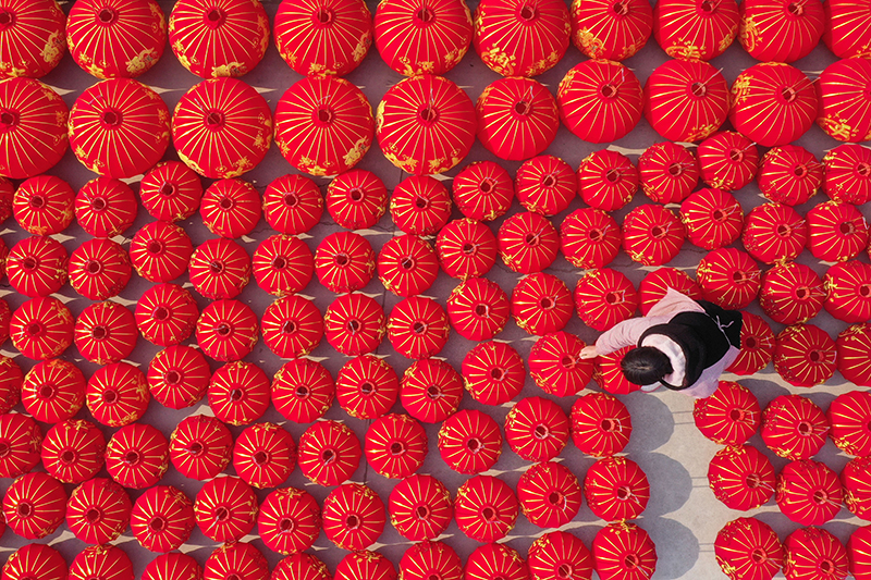 1月10日,焦作市温县赵堡镇赵堡村一家灯笼作坊的工人在晾晒红灯笼。